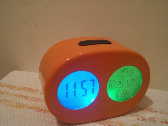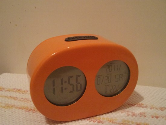 Titta vilken fin present jag har fått, en orange väckarklocka…