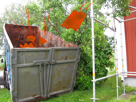 Här åker dom gamla takpannorna iväg.